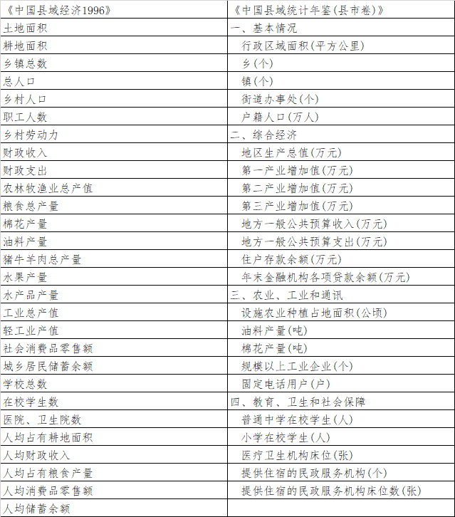 《中国县域经济1996》统计数据:土地面积;耕地面积;乡镇总数;总人口;乡村人口;职工人数;乡村劳动力;财政收入;财政支出;农林牧渔业总产值;粮食总产量;棉花产量;油料产量;猪牛羊肉总产量;水果产量;水产品产量;工业总产值;轻工业产值;社会消费品零售额;城乡居民储蓄余额;学校总数;在校学生数;医院、卫生院数;人均占有耕地面积;人均财政收入;人均占有粮食产量;人均消费品零售额;人均储蓄余额。